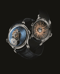 鑽石版是採用黑色漆藝錶盤,簡潔版則換上扭索飾紋錶盤,放射扇形拱狀花紋將視線帶往極具張力的品牌自製機芯身上。而扭索飾紋錶盤是由Kari Voutilainen負責,共有兩種版本:黑色扭索飾紋錶盤配玫瑰金錶殼;另一款是天空藍搭配鉑金錶殼,呈現截然不同的樣貌,各限量18枚。