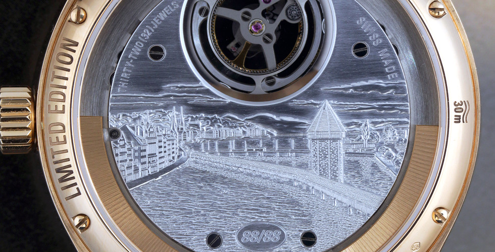 第一款是專為品牌130周年而創製、限量88枚的傳承系列雙外緣陀飛輪腕錶限量版。直徑42.5毫米錶殼採用18K玫瑰金打造,而機芯夾板則以18K白金手工製作,上面更刻有琉森城市的明媚風光,其中一個特別細節更是別具意義!細心留意,便會留意到湖上有一隻天鵝!寓意寶齊萊於1888年開設第一家專業鐘錶珠寶店就是位於琉森的天鵝廣場(Schwanenplatz),更有趣的是,88枚腕錶上的天鵝位置並不相同,也因此令每一枚傳承系列雙外緣陀飛輪腕錶限量版都是獨一無二!