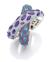 由90年代推出首個系列至今,FAWAZ GRUOSI以原創前衛的暗黑風格見稱,當中黑鑽,不對稱耳環,以及破格的色彩寶石組合更是其招牌作。經過一年多的籌備,大師帶來了新作品Colorissima色彩魔法系列,將不同顏色和份量十足的寶石,大膽地拼湊在一起,令每件珠寶突顯強烈的華麗風格及艷麗美色,透過精湛工藝將色彩發揮得淋漓盡致,令人目眩。品牌珠寶總監更認為:「將組件結構拼合起來最困難,戒指由五部份組成,首先要將之組合起來,效果滿意就將之拆開然後才鑲嵌寶石,工序極之複雜精微,工匠的手工極之精準。」