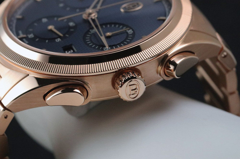 直徑42毫米精鋼錶殼,鉑金滾花錶圈,藍色格狀大麥粒飾紋錶盤/時分指示,小秒,計時功能,日期顯示/PF070自動上鍊機芯,5赫茲高頻,動力儲存65小時,22K玫瑰金擺陀,COSC瑞士官方天文台認證/參考價:HK$240,000