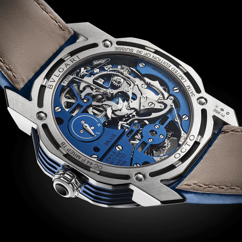 腕錶搭載 BVLGARI 自製 BVL428 手動上鍊機芯,藍色新品全球限量 30 枚。具份量感的錶殼是為了提高三問結構的扭力,藉以產生更多聲音能量,實現最佳聲音傳播效果。採用鏤空結構的錶環,以最少量的金屬隔開內層與外層,創造最大聲音共鳴並盡可能傳導聲音,同時配合三種音簧設計了三個開口,讓傳導聲音共鳴。為了使聲音更有效傳播,音簧直接固定於錶身,錶殼材質也選擇傳導效果最好的鈦金屬。底蓋同樣挖空,並加入鈦金屬網格,有助報時音的共鳴與傳播。腕錶是由三種不同音階的音鎚依序敲擊出鐘樂,以 Do 報時,Mi-Re-Do 報刻,單音 Mi 報分,報時機制啟動按把位於錶環左側。機芯配置一個古典發條盒,確保上緊發條後動力儲存至少 75 小時;報時機制則由圓柱形盒中的發條來提供動力,此發條盒是直接於橋板鑽孔製成。音鎚、音簧、陀飛輪框架和鏤空表面以交替拋光精鋼製成,精緻的夾板和橋板則經過 ALD處理。這種以碳為原料的高科技真空沉積法可以做出優雅深邃的藍色外觀。