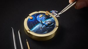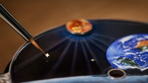 運用四種琺瑯工藝讓 Tambour Taiko Galactique 的錶盤栩栩如生,由橘綠白藍組成地球的華麗色彩是層層微繪琺瑯完成。而事實上,至少需要七種顏色才能描繪此陸地圖案。除了用精密細節與選色完美呈現地球,琺瑯師的工作還需為雲朵傾注生命力,完美操控模糊和清晰間的變化,呈現最吸睛的真實效果。所用藍色的優美與深度也發揮視覺作用。最後為了加深這場幻覺,這顆星球彿彷逐漸消失在宇宙邊界。幾許星光之所以璀璨生輝,皆得益於精緻的金屬薄片嵌飾工藝——將黃金箔片貼在錶盤上,然後再塗上琺瑯,乳白色的琺瑯便完美復刻出夢幻的月暈和太陽閃焰,從而重現太陽光線照亮錶盤的效果。而太陽在金屬薄片嵌飾工藝加持下變得真實:在不同層透明琺瑯之間鑲嵌金箔,彰顯出黃金的流光溢彩,然後加入橘色與紅色琺瑯呼應星星炙熱的面貌。太空人採用內填琺瑯工藝製作,彷彿無重量般漂浮在月球上。運用灰調琺瑯完美呈現月球表面,精緻入微地重現隕石坑:灰調琺瑯工藝是以黑色為底並層層塗繪白色琺瑯,產生細膩的明暗對比效果。裝飾太空衣上的紅色 Monogram 花朵是純手工微繪琺瑯,不僅精細,更需要塗三層琺瑯,是極高精密度的工藝。最終,八層工藝為獨特裝飾賦予光澤閃耀的質感。