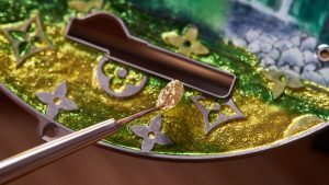本作品的另一大挑戰是錶盤上進行的金屬薄片嵌飾工藝。此技術難度極高,因為金屬薄片嵌飾工藝需要將脆弱易破的金箔放置於琺瑯上,並在每朵 LV Monogram 花朵之間單獨放置條形金箔,並小心翼翼地鑲嵌於每件微縮品上。金屬薄片嵌飾工藝完美融入錶盤上的其他圖形元素,更賦予河流金璨光澤與充滿真實感的透明度。