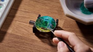 以獨創琺瑯工藝結合雕刻藝術,La Fabrique des Arts 工坊真正嘗試嶄新工藝和創新——最終共需約120 小時的琺瑯工藝。承襲 Carpe Diem 和 Tambour Opera 累積的工藝經驗,工匠們面臨全新挑戰並昇華其專業,研發出適合面具厚度的超薄工藝,同時保留鮮豔色彩與立體感。